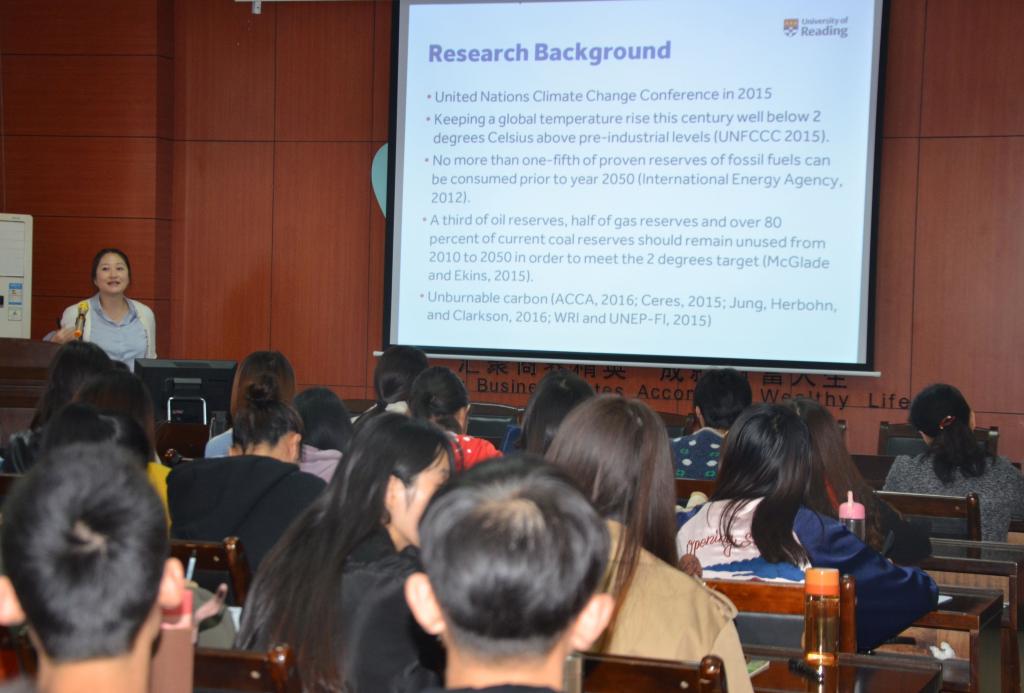 11月2日下午,英国雷丁大学研究生教学计划高级导师刘洋博士应邀至RAYBET官方网站,在行政楼801报告厅为我们研究生坐了题为“Carbon Asset Risk Disclosure: Determinants and Firm-Value Effects”的主题讲座,报告会由王新红老师主持,雷竞技ray官网会计专业100名师生到场聆听。