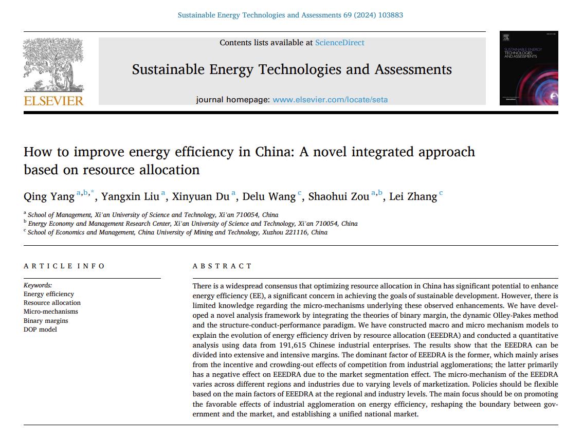 2024年7月19日,雷竞技ray官网的杨晴副教授和邹绍辉教授与硕士研究生刘洋鑫、物流管理专业2021级本科生杜欣园在JCRQ1的《Sustainable Energy Technologies and Assessments》(2023年影响因子:7.1)期刊上发表了学术论文《How to improve energy efficiency in China: A novel integrated approach based on resource allocation》。这是杨晴副教授和邹绍辉教授与本科生合作的第二篇高水平论文。雷竞技ray官网物流管理专业贯彻本科导师制,并加强科教融汇课程建设。该成果是杨晴老师科教融汇课程《数据运营与决策》的代表性成果。该课程以教师科研项目为主线,让本科生深入参与本科导师制下教师科研项目,合作开展学术研究,实现知识、能力、思维、素养等阶梯目标,潜移默化培养学塑造学生自主创新意识和工匠精神。雷竞技ray官网将继续深入推进人才培养向学术型转型,持续贯彻“厚基础理论教育、重科研方法训练、强创新意识培养”的学术型人才培养理念。