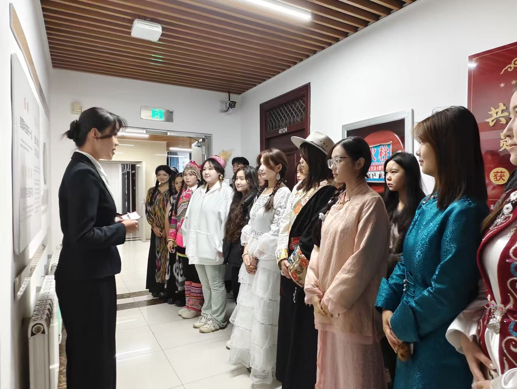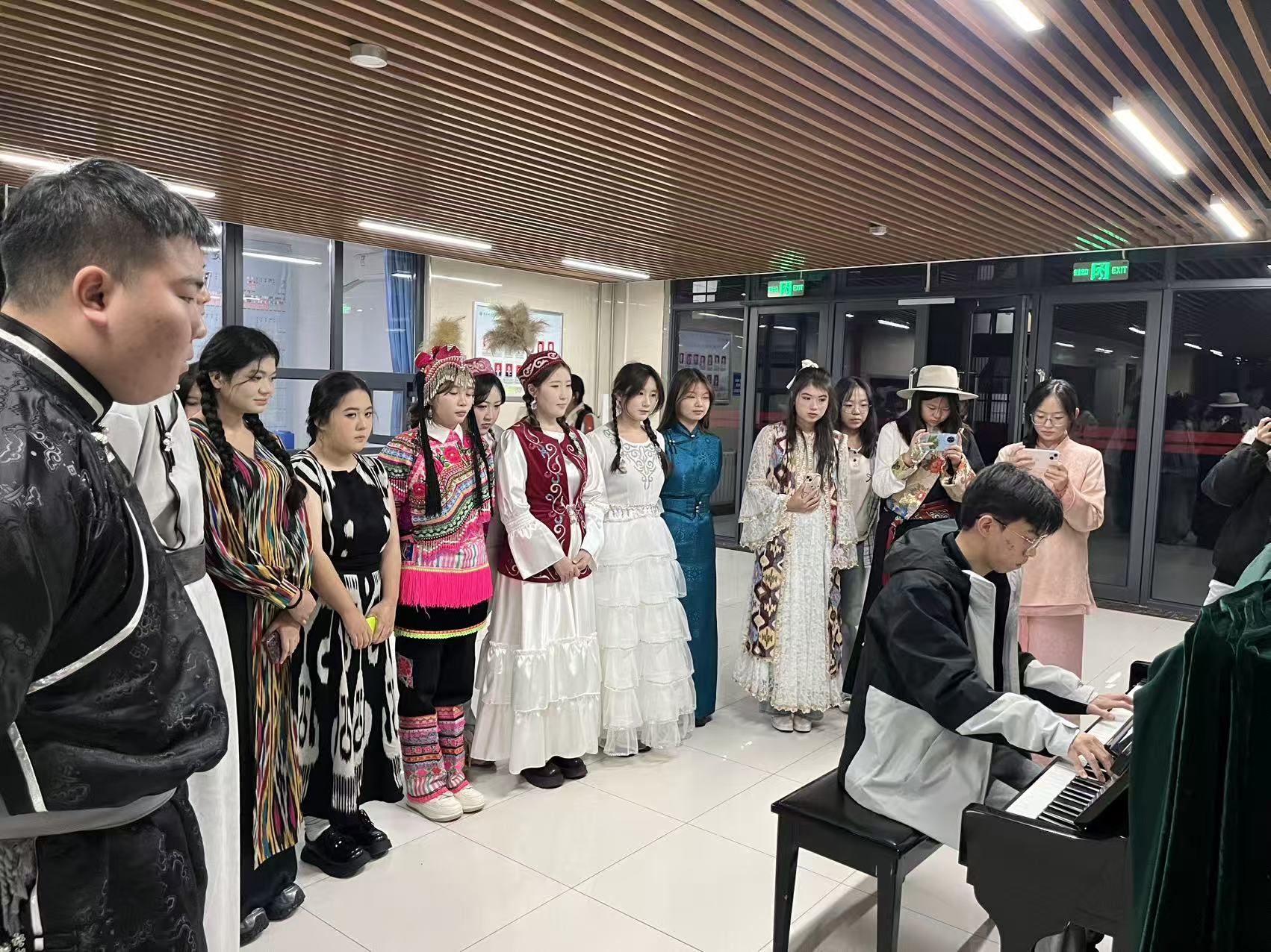 为促进各民族学生交往交流交融,学院创新形式,举办了“校史长廊传薪火,民族艺韵展风华”主题教育活动。同学们在讲解员引导下参观了“一站式”学生社区的校史文化墙,从学校发展历程中感悟与时代同行的奋斗精神。随后的文化交流环节精彩纷呈,各民族学生化身“文化使者”,通过展示艾德莱斯绸、蒙古袍、藏装等特色服饰及其文化内涵,并辅以蒙古族乐器演奏、哈萨克族弹唱、钢琴演绎民族音乐等多元艺术形式,展现了中华文化的绚丽多彩与深厚底蕴。活动现场气氛热烈,欢声笑语不断,“各民族像石榴籽一样紧紧抱在一起”的生动画面深入人心,有效增强了学生的文化认同与民族情感。