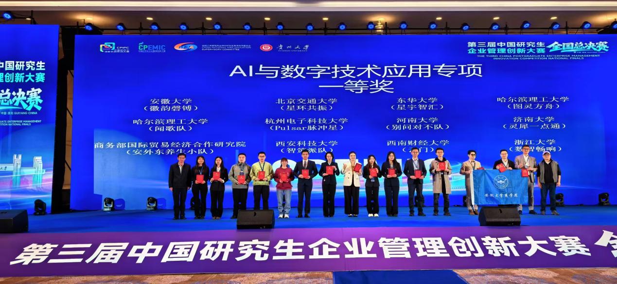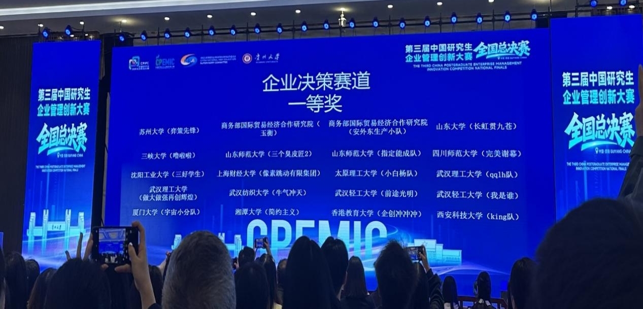 11月7日至9日,由教育部学位管理与研究生教育司指导,中国学位与研究生教育学会、中国科协青少年科技中心共同主办,全国工商管理专业学位研究生教育指导委员会联合主办的第三届中国研究生企业管理创新大赛全国总决赛在贵阳落幕。本届大赛共设四类赛道,我们学子奋勇拼搏,在三个赛道中均摘得一等奖,展现出卓越的综合实力与创新风采。