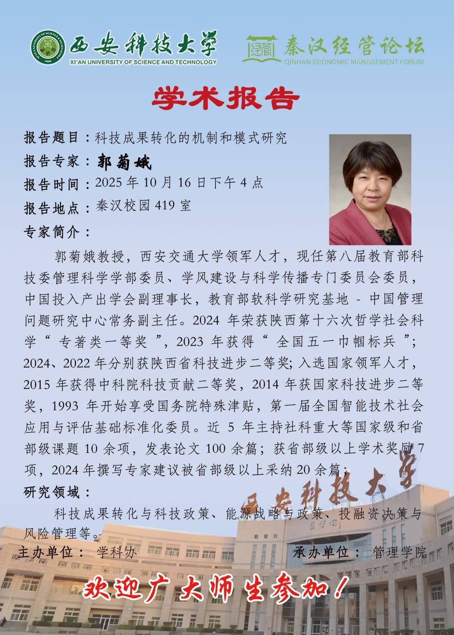 学术讲座预告:科技成果转化的机制和模式研究